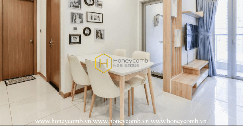 The space here creates a modern, youthful and dynamic feeling. Perhaps because of the elegant but bright colors, the apartment becomes prominent and eye-catching with small black and white paintings hanging on the wall. In addition, being located at Vinhomes Central Park- one of the most luxurious residential areas in Saigon will also give you a very interesting experience